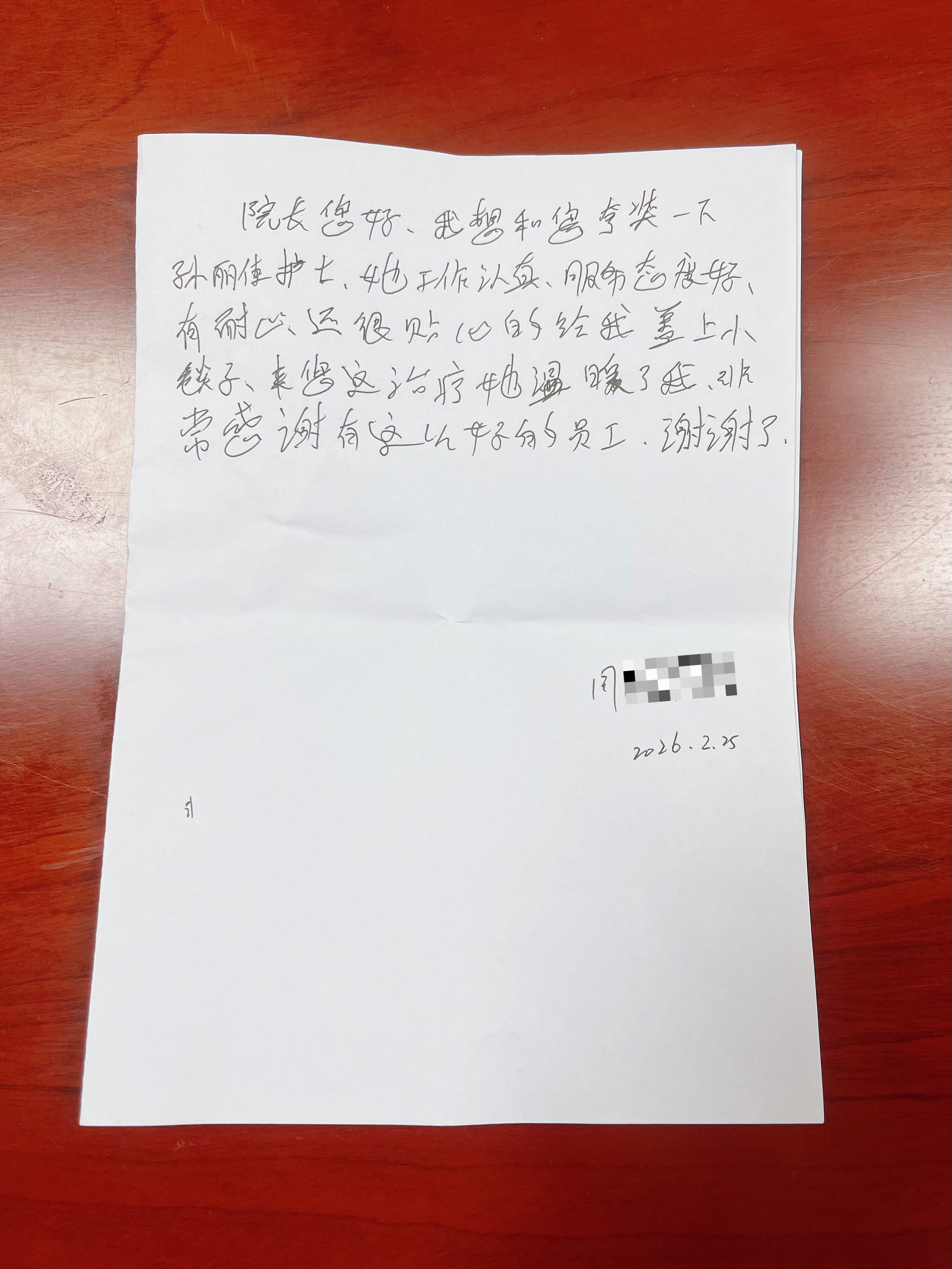 2026年2月25日,北京大望路中西医结合医院收到了一封笔迹工整却饱含深情的好评信。信中,患者闫女士用最质朴的语言写道:“院长您好,我想和您夸奖一下孙丽佳护士,她工作认真、服务态度好、有耐心,还很贴心地给我盖上小毯子,来您这治疗她温暖了我,非常感谢有这么好的员工,谢谢了。”